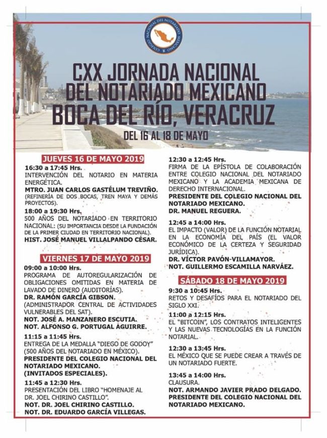 CIRCULAR No.- 44/19 COMPAÑERO (A) NOTARIO (A): En alcance a las circulares 27/19 y 39/19, te reitero la invitación a participar en la CXX Jornada Nacional del Notariado Mexicano a celebrarse los días 16,17 y 18 de mayo en el “Foro Boca”, en el municipio de Boca del Río, Veracruz; aprovecha hoy y mañana el…